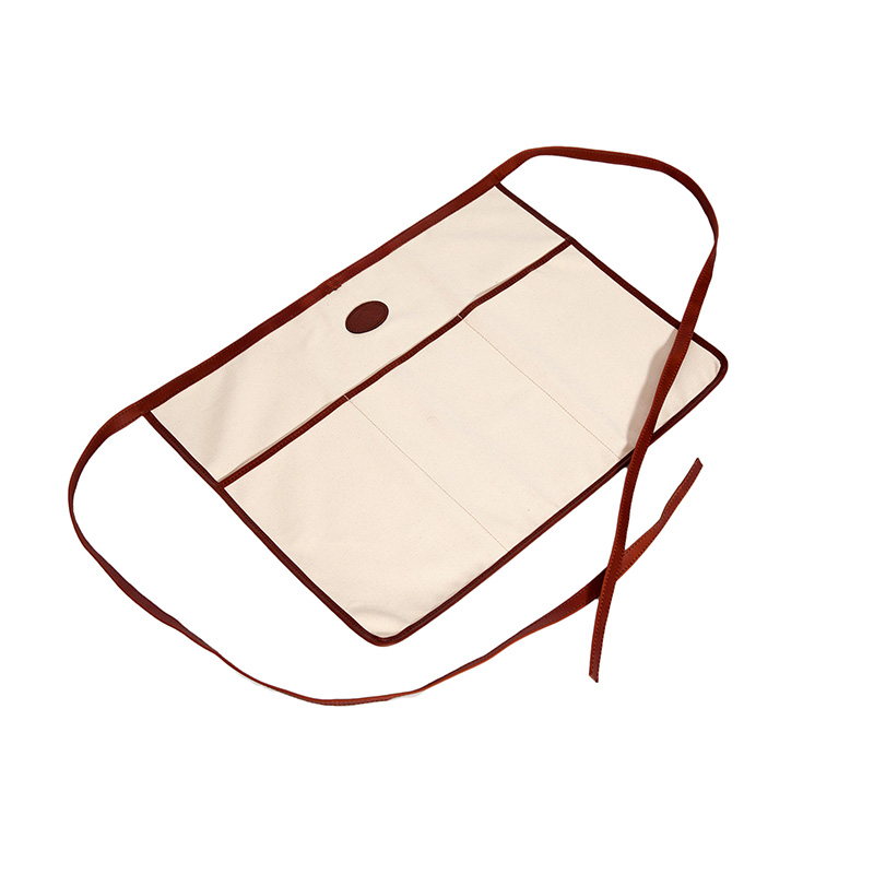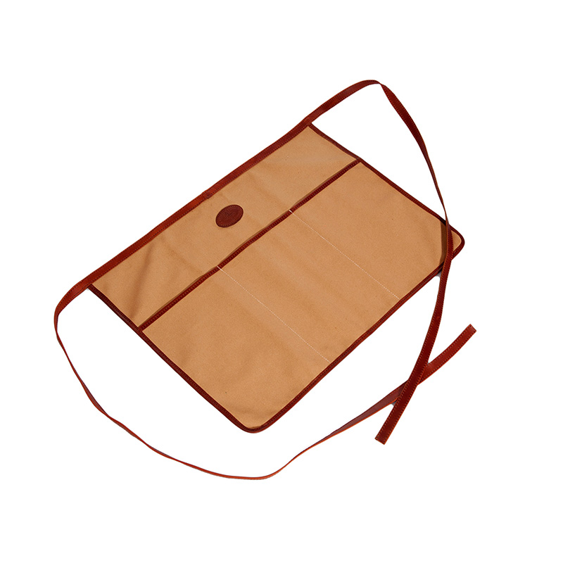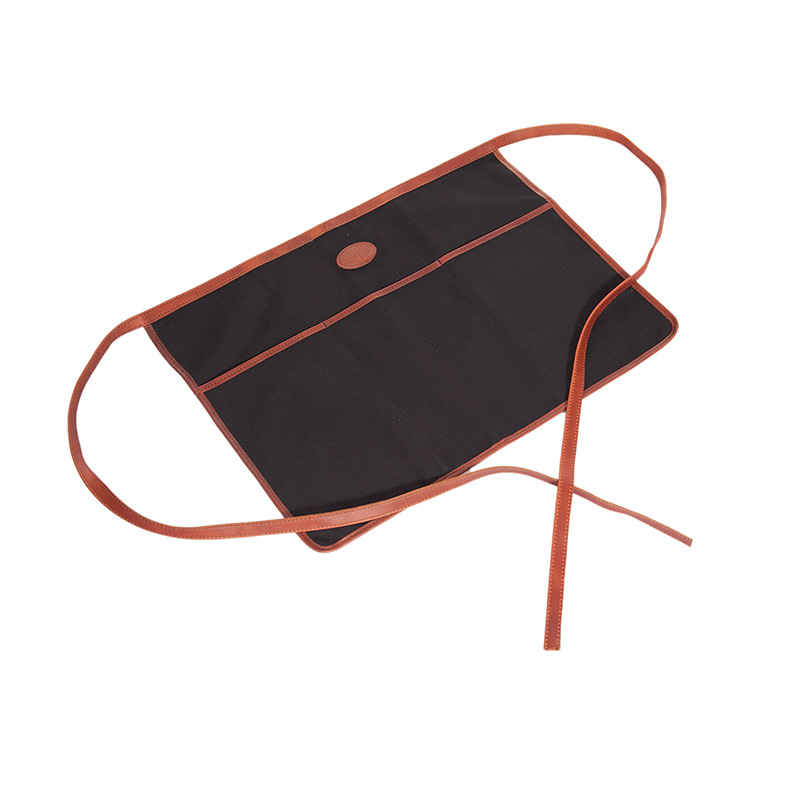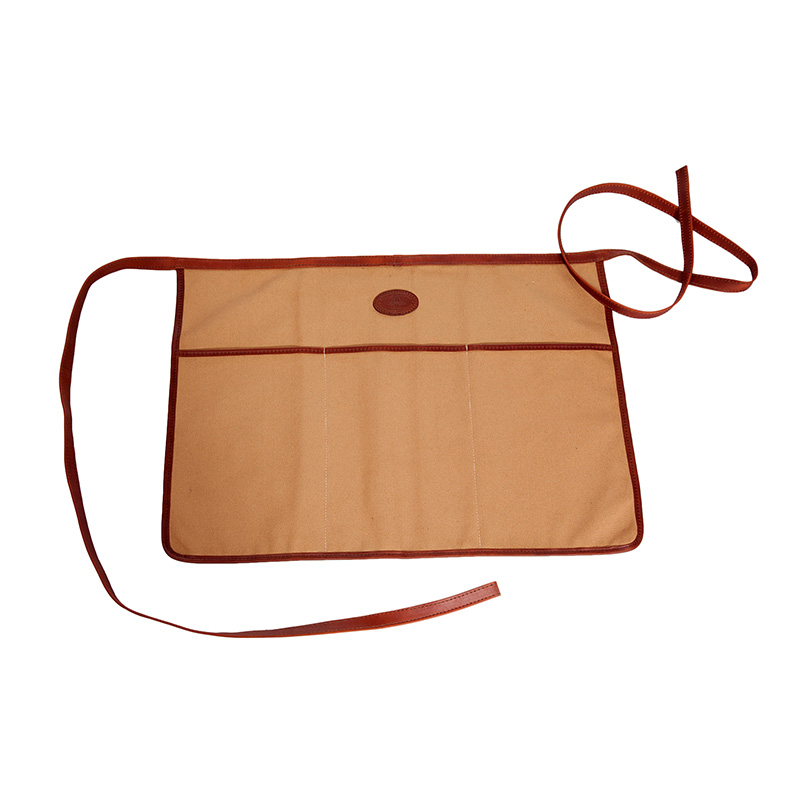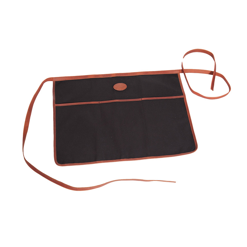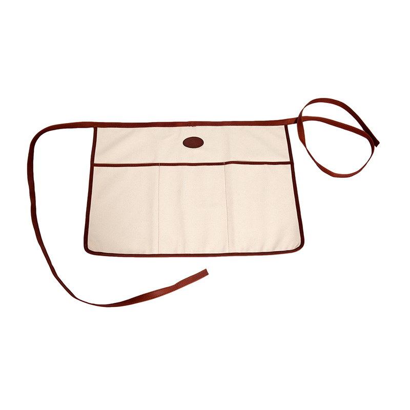 A half apron perfect for wearing around your waist. Made with 100% Cotton canvas with front pocket and leather trim.