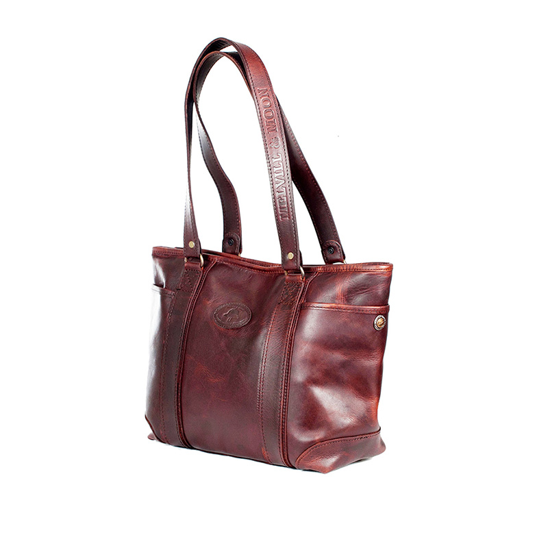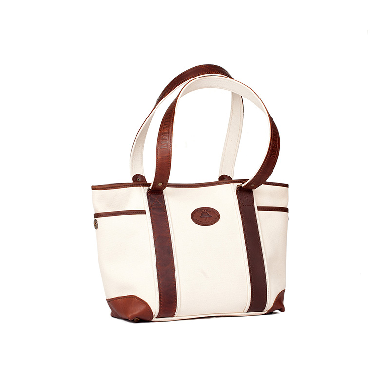 Just like the Day bag, fully lined and with as many pockets, only smaller. Also available with rolled handles to order.