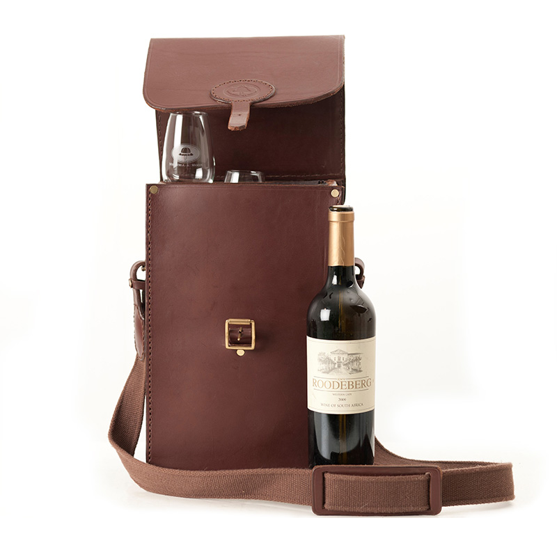 Fashioned in traditional vegetable tanned leather. It can take 2 bottles and is supplied with 6 wine taster glasses.