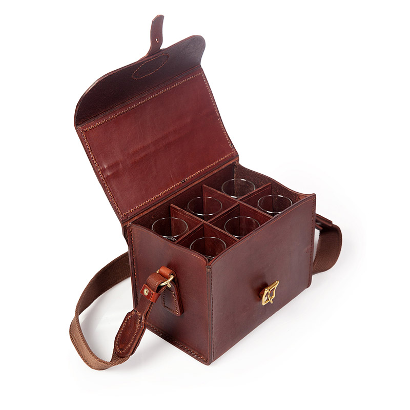 A hand stitched leather carry box , it can hold 6 glasses for your picnic or sundowners and comes with a shoulder and hand carry strap. Supplied with 6 wine taster glasses – compact and highly useful on the beach or on safari.